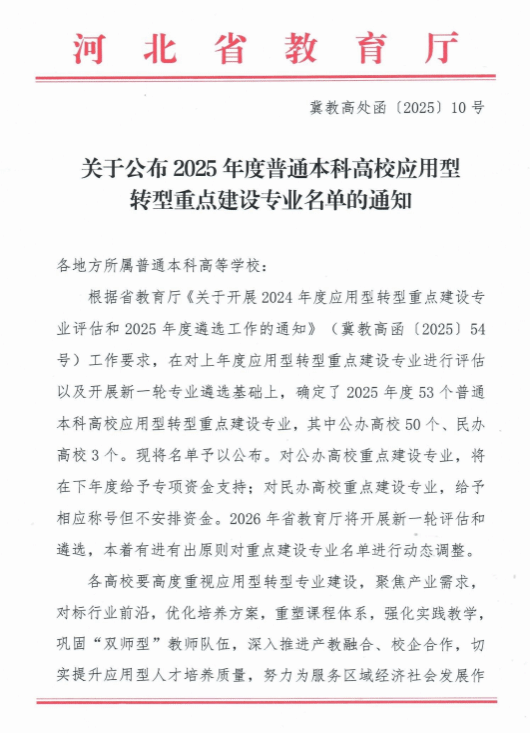 近日,河北省教育厅公布2025年度普通本科高校应用型转型重点建设专业名单,确定53个重点建设专业。我校水利水电工程、电气工程及其自动化专业连续3年入选建设名单。