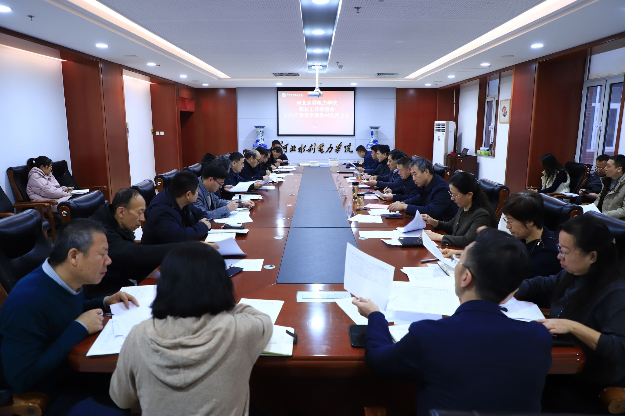为做好2026年春季学期教材选用工作,1月7日上午,我校在弘文守正楼党委会议室召开教材工作委员会会议。教务处及各教学系部依次对2026年春季学期教材选用情况进行汇报,会议审议并通过了2026年春季学期教材选用清单。党委书记张效松,党委副书记、校长王滨,党委副书记崔立功、副校长董志良及学校教材工作委员会委员出席会议,会议由王滨主持。