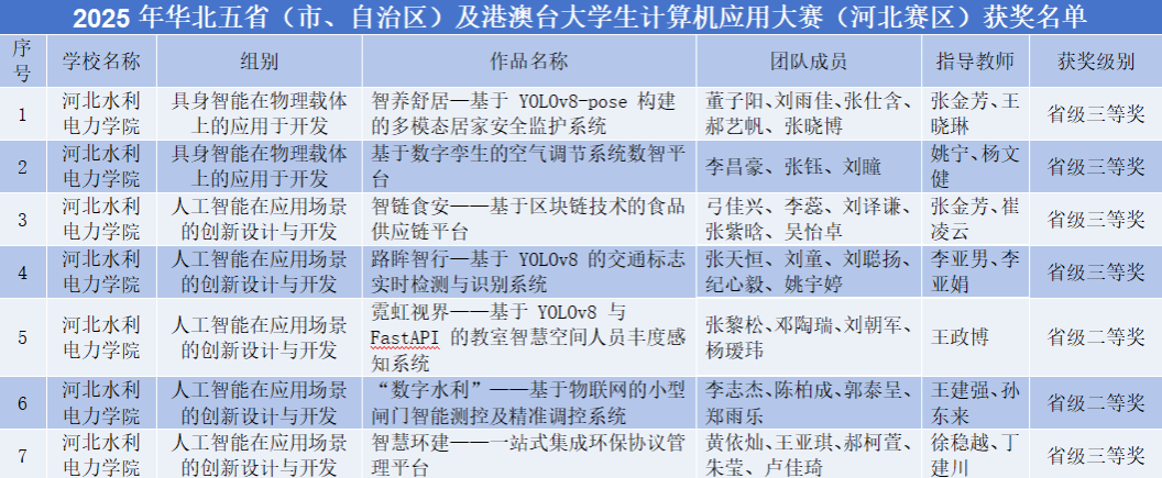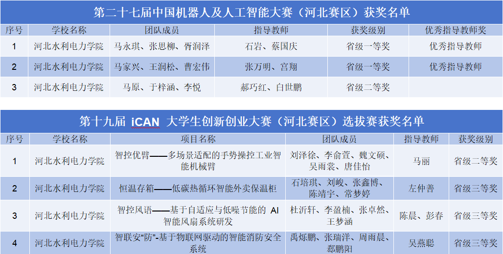 近日,河北省教育厅公布了2025年第十一届河北省大学生工程实践与创新能力大赛、2025 年华北五省(市、自治区)大学生机器人大赛等多项学科竞赛获奖名单。我校学子凭借扎实的专业知识、过硬的实践能力和创新精神,在人工智能、机器人、数学建模、艺术设计等多个领域的竞赛中脱颖而出,共斩获奖项40项,其中一等奖9项、二等奖10项、三等奖11项,同时获评优秀指导教师奖9项、优秀组织奖1项,充分展现了学校在人才培养和学科建设方面的卓越成效。