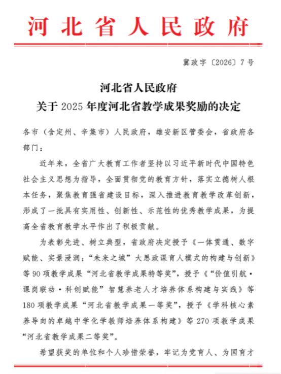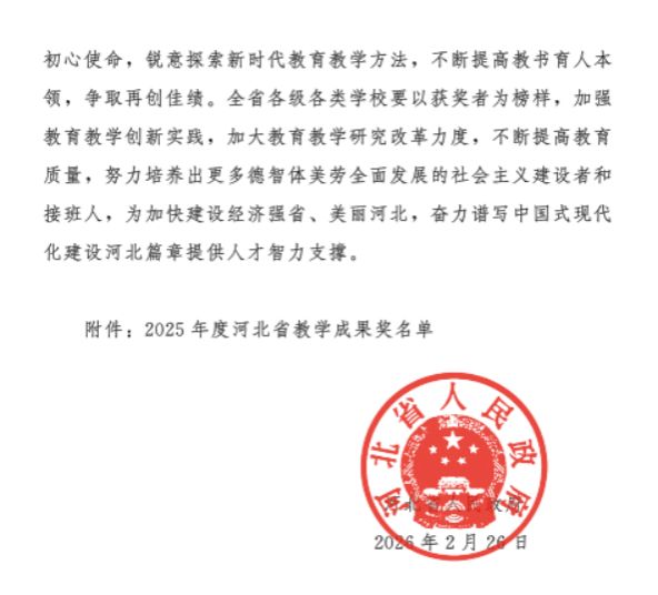 近日,河北省人民政府发布《关于2025年度河北省教学成果奖励的决定》,我校申报的三项教学成果全部获奖,其中一等奖1项,二等奖2项。